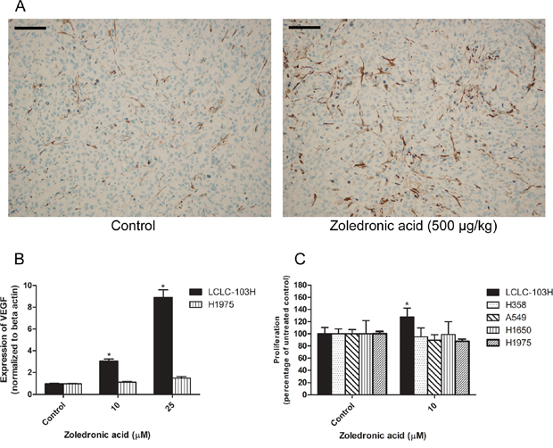 Figure 4: The effect of zoledronic acid on the in vivo vascularization of LCLC-103H xenograft and the in vitro modelling of this phenomenon. Zoledronic acid enhanced the vascularization of LCLC-103H xenograft. Vessels were labeled by immunohistochemistry using anti-smooth muscle actin (SMA). Bars indicate 100 μM A. Zoledronic acid increased the in vitro expression of VEGF in LCLC-103H cell line shown by real time PCR, however did not affect the expression in H1975 cell line significantly (mean ± SD, n=3). Beta actin served as reference. *: p<0.05 to untreated control B. The proliferation of VEGF-sensitive KS-IMM (human Kaposi-sarcoma) cells was only induced by the supernatant of zoledronic acid-treated LCLC-103H cells. A549, H358, H1650 and H1975 did not show similar significant effect (mean ± SD, n=5). Zoledronic acid was applied on the non-small cell lung cancer lines for 48 hours, thereafter filtrated supernatants were applied on KS-IMM cells for another 48 hours C.