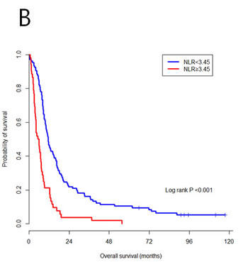 Median NLR was 2.60 (range, 0.64-17.60), PLR was 142.85 (range, 6.60-17.60) and SII was 584.93 (44.75-6195.20). Cut-off values of NLR, PLR and SII to separate OS were 3.45, 89.62 and 572.38, respectively (Table 2), and NLR was the only biomarker with significant p value in cross-validation, as shown in Table 3. The patients with lower NLR than the cut-off showed longer OS (p < 0.001) (Figure 2B). Cubic splines model between hazard ratio and each marker of NLR, PLR and SII also showed a positive relation (Supplementary Figure 3A-3C).