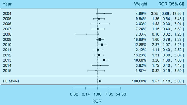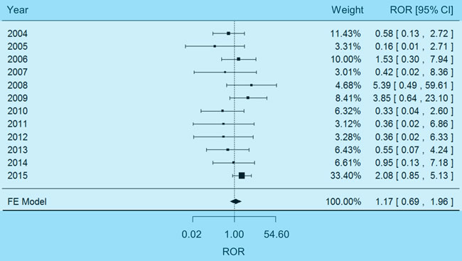 The pooled analysis on hyponatremia involved a total of 19901 adverse event reports (see Materials and Methods), among which 3907 reports (19.63%) were related to patients exposed to carboplatin. The χ2-based Q test [17] indicated no significant heterogeneity underlying the FAERS reports of different years (P = 0.37, I2 = 8%), so a fixed-effects model was selected to estimate the weighted average of effect size. The pooled reporting odds ratio (ROR) [18] proved to be significantly higher than 1.00 (Figure 1), suggesting that carboplatin therapy was associated with hyponatremia among non-small cell lung cancer patients (pooled ROR = 1.57, 95% CI 1.18-2.09, P = 1.99×10-3). There was no evidence of reporting bias in the above results, since the Egger’s test [19] validated the symmetry of funnel plot (Supplementary Figure 1, P = 0.23).