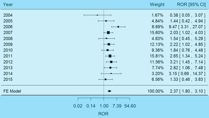 The FAERS reports were also analyzed for hypokalemia adverse events. No significant heterogeneity between different years was detected with the χ2-based Q test (P = 0.27, I2 = 18%), so a fixed-effects model was selected to pool the data. Combining effect sizes of different years as an outcome lead to a pooled ROR significantly higher than 1.00 (Figure 2), indicating the association between carboplatin therapy and hyponatremia (pooled ROR = 2.37, 95% CI 1.80-3.10, P = 5.24×10-10). No significant reporting bias was observed with Egger’s test, namely, the shape of funnel plot did not show evident asymmetry (Supplementary Figure 2, P = 0.36).