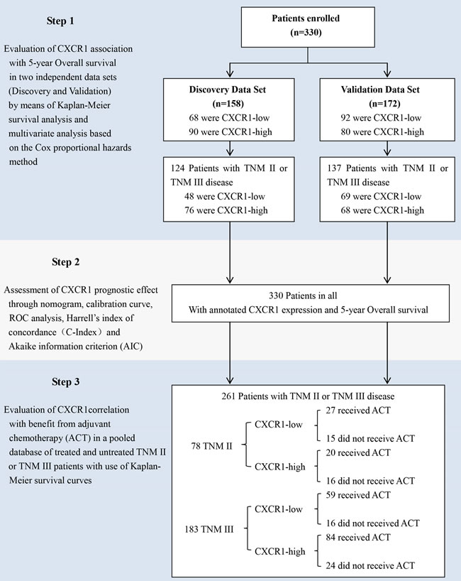 Figure 1: Study design. A total of 330 consecutive patients who suffered from resectable gastric cancer underwent R0 gastrectomy with standard D2 lymphadenectomy between August 2007 and December 2008 in Zhongshan Hospital, Fudan University (Shanghai, China) was enrolled in the study. The relation between CXCR1 expression and overall survival was tested in two independent randomly-assigned patient cohorts: discovery data set and validation data set. The association between CXCR1 expression and benefit from adjuvant chemotherapy (ACT) was tested in a pooled database of 78 patients with TNM stage II disease and 183 patients with stage III disease from the two independent data sets.