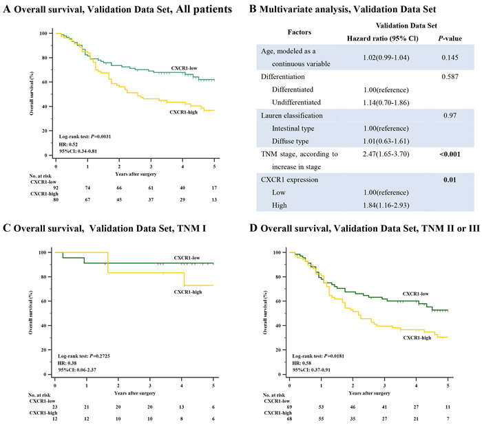 Figure 3: Relation between CXCR1 expression and overall survival in the validation data set. (Panel A.) Overall survival, validation data set, all patients (n = 172, P = 0.0031, HR: 0.52, 95% CI: 0.34-0.81). (Panel B.) Multivariate analysis, validation data set. (Panel C.) Overall survival, validation set, TNM I patients (n = 35, P = 0.2725). (Panel D.) Overall survival, validation set, TNM II or III patients (n = 137, P = 0.0181, HR: 0.58, 95% CI: 0.37-0.91). P-values were calculated by log-rank test.