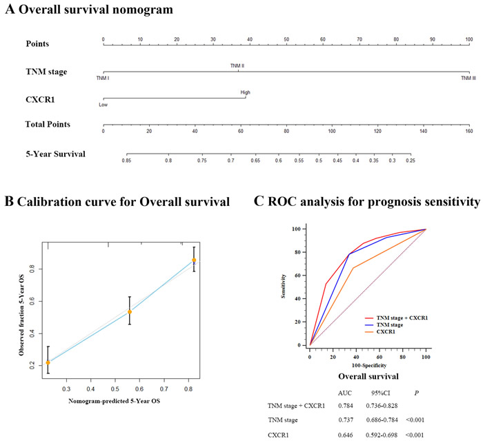 Figure 4: Prognostic nomogram, calibration curve and ROC analysis of prognostic model with CXCR1 expression for resectable gastric cancer. (Panel A.) Nomogram to predict overall survival (OS) at 5 years after gastrectomy. (Panel B.) Calibration curve for nomogram predicted 5-year overall survival performed well with the ideal model. Line of dashes: ideal model; vertical bars, 95% confidence interval. (Panel C.) ROC analysis of the prognosis sensitivity and specificity for the overall survival by TNM stage/CXCR1 expression model, TNM stage model, and CXCR1 expression model.