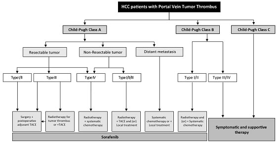 A multidisciplinary team to coordinate diagnosis and treatment of HCC patients with PVTT provides maximal benefits to patients. The therapeutic plan for the treatment of HCC with PVTT formulated by the National Research Cooperative Group for Diagnosis and Treatment of Hepatocellular Carcinoma with Tumor Thrombus is presented in Figure 1. Patients with Child-Pugh A liver function can undergo any treatment according to the PVTT type. When the lesion is resectable and when there is no extrahepatic metastasis, patients with type I/II PVTT should undergo surgical resection of the PVTT en bloc with the primary HCC. For patients with PVTT type III, the treatment choices include surgery, radiotherapy, and/or TACE depending on the patient’s preference. For unresectable lesions, patients with type I/II PVTT should receive radiotherapy combined with TACE as the primary treatment, and patients with type III and IV PVTT should receive radiotherapy or systemic therapy. Patients with Child-Pugh B liver function should first receive antiviral treatment for HCC secondary to hepatitis B or C infections. If the liver function improves to Child-Pugh A, then these patient subgroups can be treated as mentioned above. Surgery and TACE are not recommended for Child-Pugh B patients. Child-Pugh C patients should only receive supportive care. Child-Pugh A and Child-Pugh B patients who have extrahepatic metastases can receive systemic chemotherapy and/or local treatment. Sorafenib can be used for patients with all extents of PVTT with Child-Pugh A and B liver function.