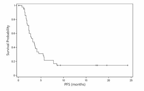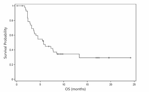 As shown in Table 3, overall evaluation showed a disease control rate (DCR) of 53.9% and a derived DCR of 15.9%. In addition, the median time to progression (TTP) was 5.6 months (95% CI: 2.9 months- NA; Figure 1), and the median progression-free survival (PFS) was 3.2 months (95% CI: 2.3- 4.1 months; Figure 2). In addition, the median overall survival (OS) was 5.7 months (95% CI: 3.7- 8.5 months; Figure 3).