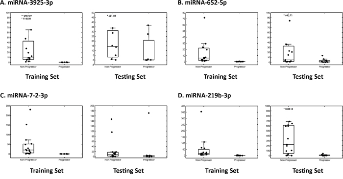 Figure 1: Box plot of four candidate miRNAs in the training and testing set. Box plots illustrate the distribution and abundance of candidate miRNAs in tissue samples from patients with EAC Progressors versus EAC Non-Progressors using a qRT-PCR platform. Scatter plots are overlaid on top of the box plots to visualize the individual data points for A. miR-3925-3p, B. miR-652-5p, C. miR-7-2-3p and D. miR-219b-3p, respectively. For each candidate miRNA, the left presents results from the training set, and the right box presents results from the testing set. The bottom and top horizontal lines delineating each box plot indicate the first and third quartiles of the data, respectively, and the horizontal line inside each box plot indicates the median value. The length of the box plot whiskers is specified as 1.5 times the interquartile range (25th to 75th quartiles) of the data.