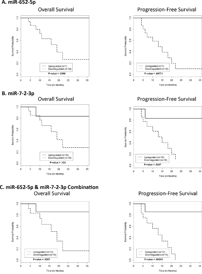 Receiver operating characteristic (ROC) curve analysis was used to establish the threshold for each miRNA, to define the cut-off of whether a subject showed downregulated (Progressor) or upregulated (Non-Progressor) miRNA expression [37]. A Log-Rank Test and Kaplan-Meier Survival Curves in R were used in the testing set to investigate if there was a difference in OS and PFS between patients classified as upregulated or downregulated (A Package for Survival Analysis in S. Version 2.38).