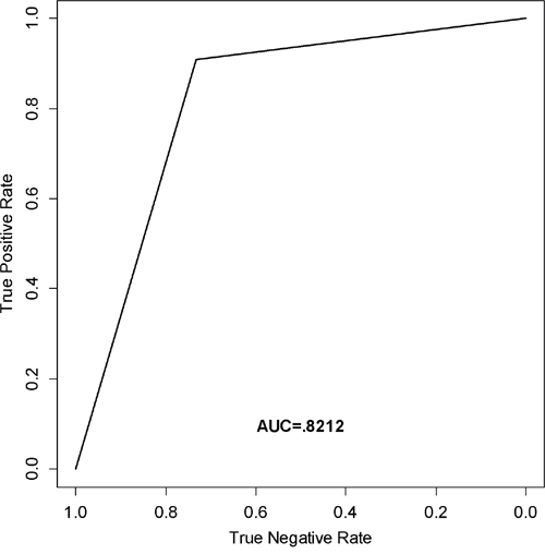 Figure 3: ROC curve analysis. Receiver operating characteristic curve (ROC) generated from the testing set to estimate the classification performance of the model containing miR-652-5p and miR-7-2-3p.