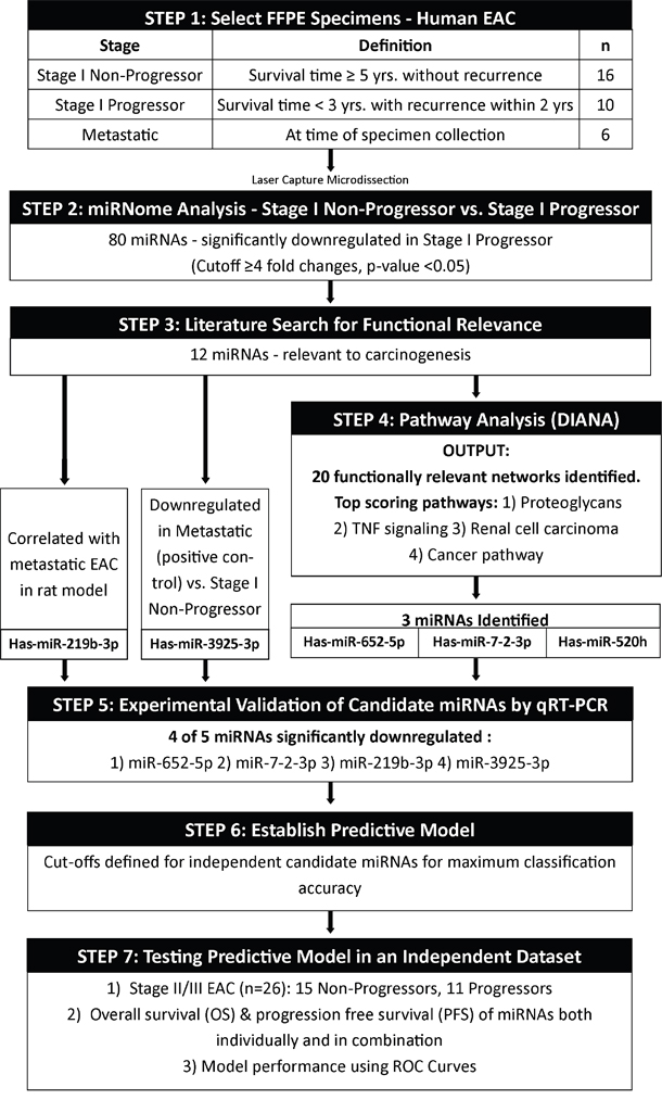 Additionally, studies establishing the utility of miRNA signatures in the management of EAC have focused on identifying a unique miRNA expression to distinguish EAC from Barrett’s esophagus (BE) and normal squamous epithelium, in order to identify high-risk patients for progressing to EAC [16–18]. However, the miRNA-mediated mechanisms underlying tumor progression and metastasis in EAC are not fully understood. Identifying patients with the highest-risk for developing metastasis would be extremely useful in guiding treatment with the ultimate goal of improved survival. Therefore, development of novel miRNA biomarkers in EAC patients may inform future treatment decisions for patients with regard to the severity of disease, and the aggressiveness and/or effectiveness of the therapy. The present study presents a unique miRNA expression profile as a prognostic tool relevant to EAC progression using comparative miRNA analysis.