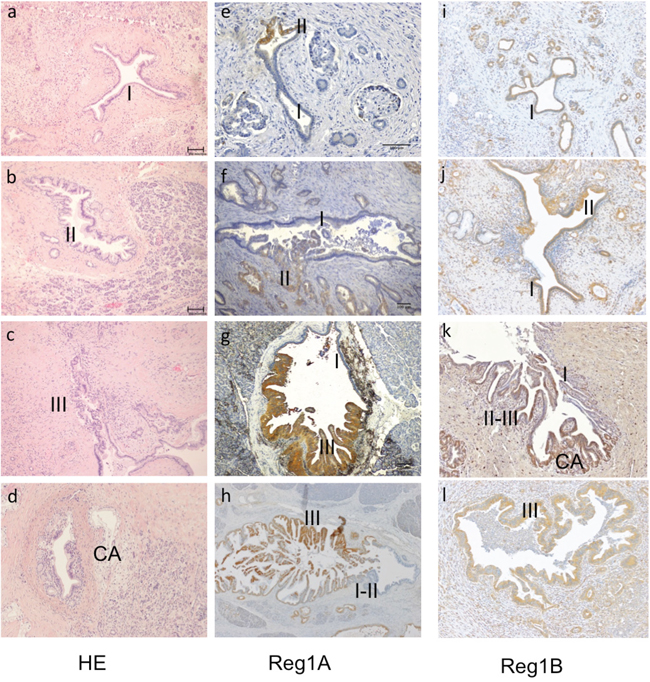 Figure 2: Association of Reg1A and 1B tissue expressions with the histological grades of PanIN lesions and invasive PDACs. A-C. Representative illustrations of the different grades of PanIN lesions, from PanIN-I, II to III. D. Invasive cancer adjacent to a PanIN-II lesion. I-III: PanIN I, II and III; CA: cancer (100x). E-H. The staining intensity of Reg1A was positively associated with different grades of PanIN, marked as I, II, III. I-L. Reg1B staining was strongly positive with different grades of PanIN seen in ducts. Representative images were selected from at least 10 fields, each at 100x magnification.