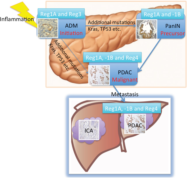 Figure 6: Summary of the roles of Reg proteins in the progression of ADM/PanIN to invasive cancer and metastasis in liver. The expression levels of Reg1A and Reg3A/G were elevated in ADM. Reg3A seems to directly promote ADM formation in vitro. The effects of additional mutations such as in Kras and TP53 transform ADM further into PanIN lesions and PDAC [43]. Serum levels of Reg1A and 1B as well as their tissue expressions were all elevated in PDAC patients. As such, increased Reg proteins may be used to differentiate PDAC from ICA.