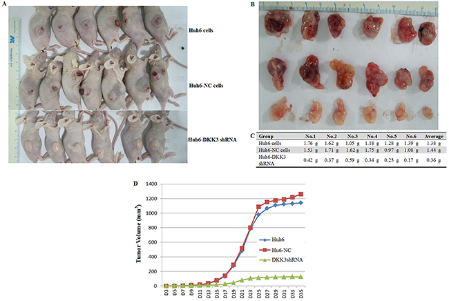 Figure 2: DKK3 knockdown inhibits tumorigenesis in vivo. A. Images of sacrificed nude mice bearing tumors 35 days after receiving transplants of Huh6 cells transfected with NC or DKK3 shRNA. B. Images of tumors from the sacrificed mice. C. Tumor weights. D. Tumor volume growth curves for nude mice 35 days after receiving Huh6 cell transplants.