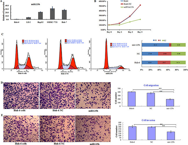 Figure 3: miR125b is downregulated in HB cells and inhibits cell proliferation and survival in vitro. A. Relative miR125b expression in five cell lines normalized to U6 expression. Error bars represent standard deviations for three repeated samples. B. Proliferation curves for Huh6 cells 3 days after transfection of control miRNA (NC) or miR125b. C. Cell cycle analysis for Huh6 cells after transfection of NC or miR125b (left) and the distribution of cells in different phases (right). D. Transwell migration assay using Huh6 cells transfected with NC or miR125b (left); numbers of migrated cells in each group are shown (right). E. Transwell invasion assay using Huh6 cells transfected with NC or miR125b (left); numbers of invaded cells in each group are shown (right). Error bars represent standard deviations for three repeated samples.