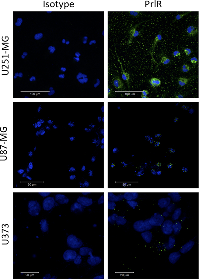 Figure 1: Immunofluorescence visualization of PrlR in U251-MG, U87-MG and U373 cells. Cells were grown on coverslips and fixed with methanol. In negative control panel the primary antibody was omitted and the coverslips were incubated with mouse IgG isotype control antibody. Immunofluorescence staining using the PrlR antibody clone 1A2B1. An immunofluorescence signal was observed at intracellular locations. The fluorescence pictures were taken using a confocal microscope.