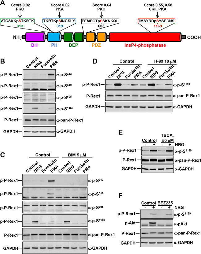 Figure 1: Regulation of P-Rex1 phosphorylation sites by different stimuli. A. Schematic representation of the different domains of P-Rex1 depicting four regulatory phosphorylation sites, and the peptides recognized by the anti-phospho-P-Rex1 antibodies. The scores and the kinases that could potentially target the different sites recognized by those antibodies are shown. B. MCF7 cells were treated with NRG (10 nM), Forskolin (10 μM) or PMA (1 μM) for 15 minutes and lysed. P-Rex1 phosphorylation in serines 313, 319, 605 and 1169 were analyzed by Western blot with anti-phospho-specific antibodies. GAPDH was used as loading control. C. MCF7 cells were pretreated with BIM (5 μM) for 1 hour and then treated with NRG, Forskolin or PMA for 15 minutes. Cell lysates were analyzed by Western blot with the indicated antibodies. D. MCF7 cells were pretreated with H-89 (10 μM) for 30 minutes and then treated with NRG, Forskolin or PMA for 15 minutes. P-Rex1 phosphorylated at S1169 and total P-Rex1 were analyzed by Western blot. GAPDH was used as loading control. E. MCF7 cells were pretreated with TBCA (50 μM) for 3 hours and then treated with or without NRG. P-Rex1 phosphorylated at S1169 and total P-Rex1 were analyzed as described above. F. MCF7 cells were pretreated with BEZ235 (500 nM) for 1 hour and then treated with or without NRG. Cell lysates were analyzed by Western blot with the indicated antibodies. The blots shown come from an experiment that was repeated at least twice.