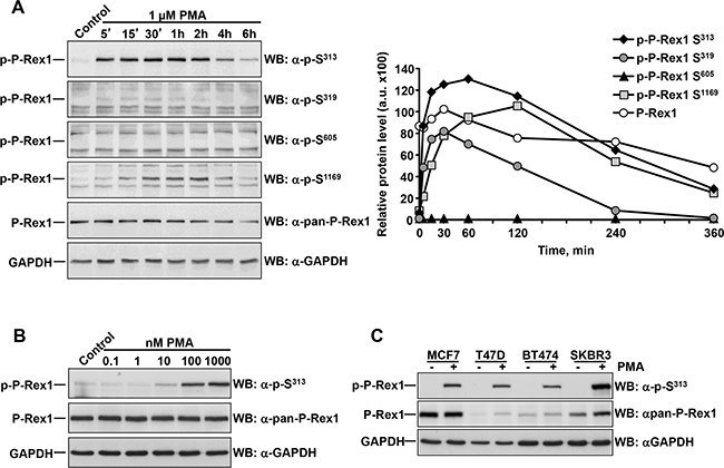 Figure 2: Dose-response and time-course of the effect of PMA on P-Rex1 phosphorylation. A. MCF7 cells were treated with PMA for the times indicated and lysed. P-Rex1 phosphorylated at S313, S319, S605, S1169, total P-Rex1 and GAPDH expression were analyzed by Western blot, and the levels of phosphorylated and total P-Rex1 quantitated and plotted. The graph represents the relative protein levels of total and phosphorylated P-Rex1 with respect to the GAPDH levels. B. MCF7 cells treated with the indicated doses of PMA were lysed and the levels of P-Rex1 pS313 and total P-Rex1 analyzed by Western. C. MCF7, T47D, BT474 and SKBR3 cells were treated with PMA for 15 minutes and lysed. P-Rex1 pS313, total P-Rex1 and GAPDH expression were analyzed by Western blot. The blots shown come from an experiment that was repeated at least twice.