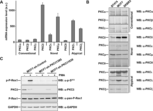 Figure 3: PKCδ knockdown reduces the phosphorylation of PMA-stimulated P-Rex1 pS313. A. Expression of the major atypical, conventional and novel PKC isoforms in MCF7 cells using data generated from expression arrays. The graph represents the levels of expression (in arbitrary units, mean±s.d., n=3) of different isoforms of PKC in MCF7 cells. B. BT474, MCF7 and SKBR3 cells were lysed. Expression of the major atypical, conventional and novel PKC isoforms were analyzed by Western blot with the antibodies indicated. C. MCF7 cells infected with the short hairpins of PKCδ (sequences #1385 and #1039) or a short hairpin control were treated with and without PMA for 15 minutes and lysed. The levels of P-Rex1 pS313, PKCδ, P-Rex1 and GAPDH were analyzed by Western blot. The blots shown come from an experiment that was repeated at least twice.