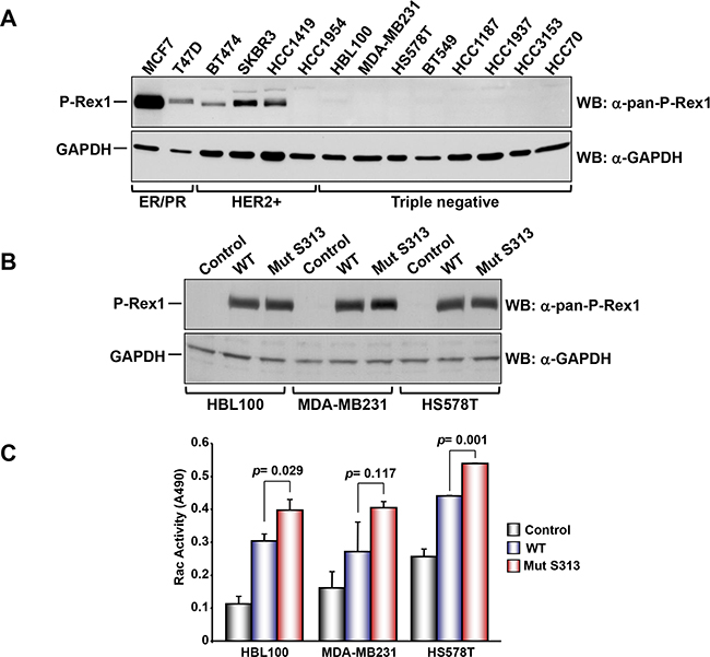 Figure 5: A. Analysis of the expression of P-Rex1 in different breast cancer cell lines. The different cells lines were lysed and the expression of P-Rex1 was analyzed by Western blot. B. HBL100, MDA-MD231 and HS578T cells were transfected with vectors coding for wild type P-Rex1 or P-Rex1 mutated in S313A and lysed. The expression of the different forms was analyzed by Western blot with the anti-pan-P-Rex1 antibody. GAPDH was used as loading control. C. Rac activity in the cell lines described above and transfected with wild type P-Rex1 or P-Rex1 mutated in S313A. The blots shown come from an experiment that was repeated at least twice.