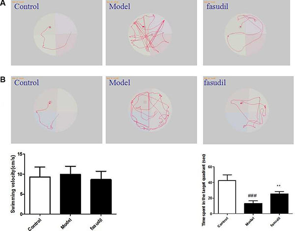 Figure 1: Fasudil improved cigarette smoke-induced learning and memory impairments. (A) Representative searching strategy of rats in the third trial on the first day. (B) Representative searching strategy of rats in the third trial on the fifth day. Control: Normal mice; Model: the smoke exposed mice; fasudil: the smoke + fasudil (5 mg/kg) mice The data was presented as mean ± SEM, Compared with sham: #P < 0.05, ##P < 0.01; Compared with vehicle:*P < 0.05, **P < 0.01.