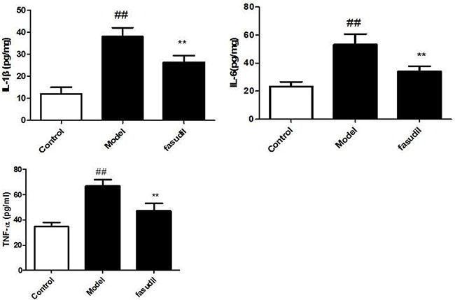 Figure 4: Fasudil inhibited the cigarette smoke-induced elevation of cytokines in serum (A) and hippocampus (B). Control: Normal mice; Model: the smoke exposed mice; fasudil: the smoke + fasudil (5 mg/kg) mice The data was presented as mean ± SEM, Compared with sham: #P < 0.05, ##P < 0.01; Compared with vehicle:*P < 0.05, **P < 0.01.