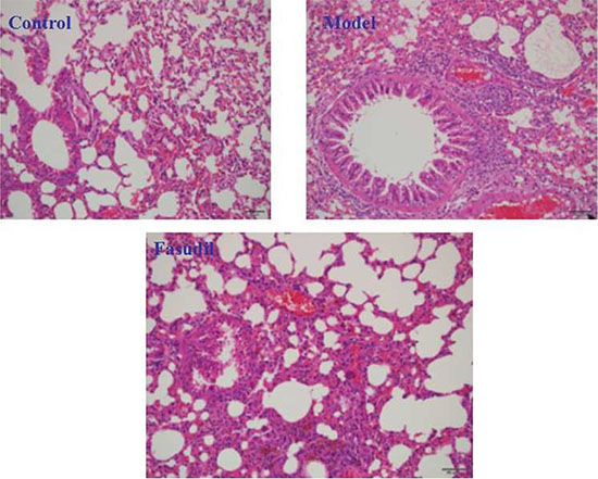 As shown from Figure 3, the lung histology of experimental mice exposed to cigarette smoke were analyze from H&E staining. The cigarette smoke-induced model group exhibited severe infiltration of inflammatory cells both in the bronchial and peribronchial layers compared with the air group. Airspace enlargements were also observed in smoke-exposed model group. In contrast, fasudil administration showed a weakened degree of inflammatory damage and lessened airspace compared to the model group. Thus, fasudil significantly abrogated the smoke stimulation-induced lung injury.