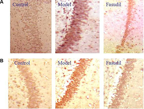 Figure 6: Fasudil regulated Rho-mediated inflammatory signalings in hippocampus by immunohistochemistry. (A) immunohistochemistry of Rho; (B) immunohistochemistry of P-NF-κBP65 Control: Normal mice; Model: the smoke exposed mice; fasudil: the smoke + fasudil (5 mg/kg) mice