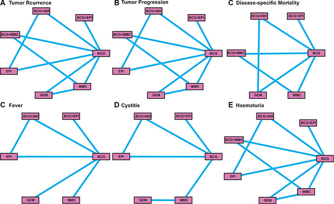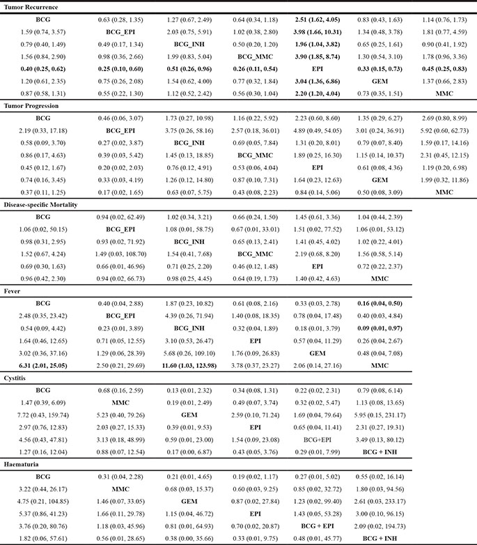 The summary odds ratios (ORs) of the corresponding outcomes (TR, TP, DM, fever, cystitis, haematuria) for each direct comparison were calculated. The results of pair-wise meta-analysis were showed in Table 2. Patients with EPI exhibited an increased risk of TR compared to those with BCG (OR = 1.58, 95% CI = 1.23–1.90, P < 0.001). By contrast, patients with BCG+MMC exhibited a significantly lower risk of TR than those with BCG (OR = 0.25, 95% CI = 0.10–0.61, P = 0.002). Besides that, patients with EPI or MMC exhibited a higher risk of TP than those with BCG (EPI: OR = 1.71, 95% CI = 1.16–2.53, P = 0.007; MMC: OR = 3.05, 95% CI = 2.24–4.17, P < 0.001). Moreover, patients with MMC were associated with a reduced risk of fever compared to those with BCG (OR = 0.22, 95% CI = 0.13–0.38, P < 0.001), while those with BCG + INH were associated with an increased risk of fever in relation to patients with BCG (OR = 1.92, 95% CI = 1.25–2.94, P = 0.003). Furthermore, both EPI (OR = 0.64, 95% CI = 0.48–0.86, P = 0.003) and BCG + EPI (OR = 0.44, 95% CI = 0.23–0.86, P = 0.016) appeared to be more effective than BCG in reducing the risk of cystitis. Finally, patients with MMC (OR = 0.55, 95% CI = 0.41–0.75, P = 0.011) and EPI (OR = 0.54, 95% CI = 0.39–0.74, P < 0.001) were associated with approximately 45% reduction in the risk of haematuria.