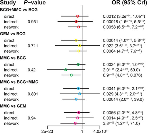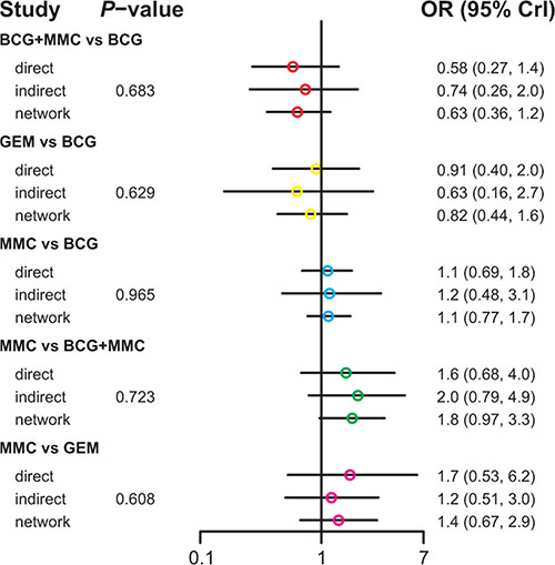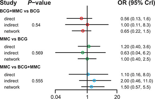 Table 3 demonstrated the mixed comparisons results by synthesizing all evidence within the network. Patients with all other treatments exhibited a significantly lower risk of TR than those with EPI (OR = 0.40, 95% CrI = 0.25–0.62; OR = 0.25, 95% CrI = 0.10–0.60; OR = 0.51, 95% CrI = 0.26–0.96; OR = 0.26, 95% CrI = 0.11–0.54; OR = 0.33, 95% CrI = 0.15–0.73; OR = 0.45, 95% CrI = 0.25–0.83). On the other hand, patients with MMC exhibited experienced 84% and 91% reduction in the risk of fever compared to those treated with BCG and BCG+INH, respectively (OR = 0.16, 95% CrI = 0.04–0.50; OR = 0.09, 95% CrI = 0.01–0.97). As suggested by Figures 2–5, no significant inconsistency between direct and indirect evidence was presented with respect to TR, TP, DM or haematuria and thereby a consistent model was used in our analysis.