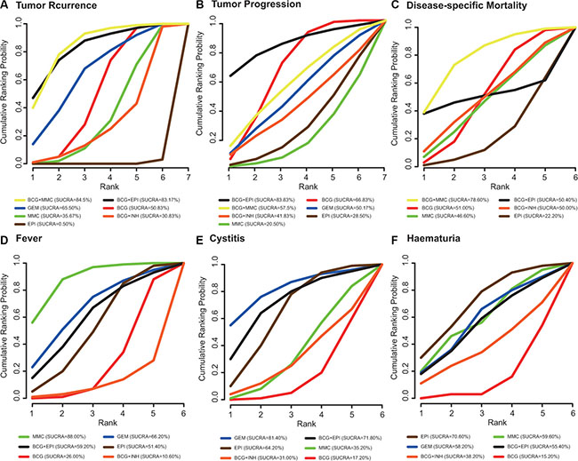 Figure 6: The corresponding results of SUCRA with respect to six endpoints (A) tumor recurrence; (B) tumor progression; (C) disease-specific mortality; (D) fever; (E) cystitis; (F) haematuria.