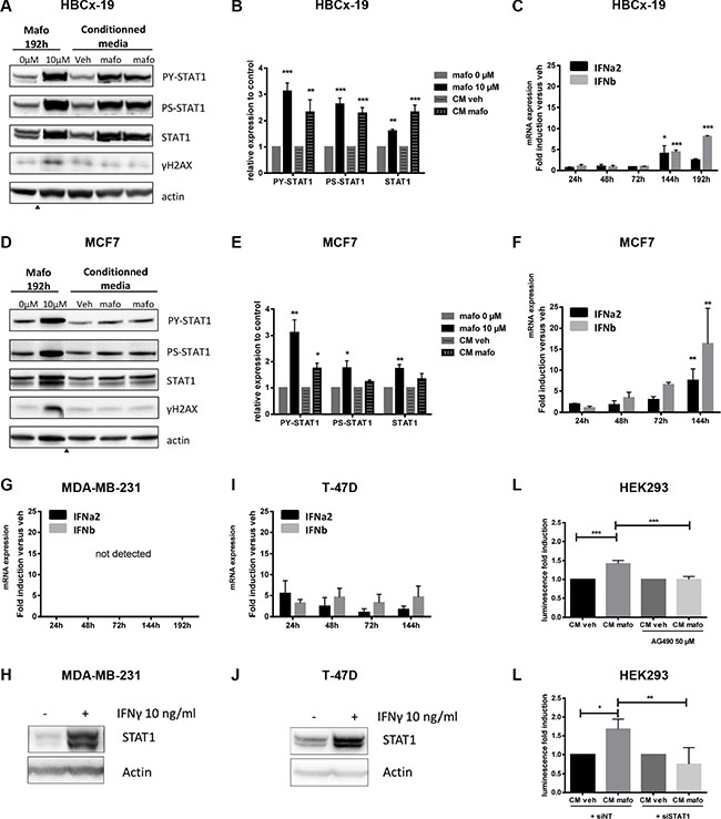 Figure 1: STAT1 phosphorylation and up-regulation of IFN-inducible genes is observed in some but not all breast cancer cells in response to mafosfamide treatment. (A, B) Dose-response effect of mafosfamide on the in vitro proliferation of HBCx-19, MCF7, MDA-MB-231 and T-47D cells 3 (A) or 6 (B) days after treatment. Results (n = 3 independent experiments) are expressed as percentage of growth with respect to the increased cell density between day 0 and days 3 or 6 in the absence of treatment. (C) Western blotting analysis of P-STAT1Y701, P-STAT1S727 and total STAT1 in HBCx-19 cells showing the time course induction of the STAT1 pathway following mafosfamide treatment (added at T0). ≣H2AX reflects drug-induced DNA damage. (D) Quantification of P-STAT1Y701, P-STAT1S727 and total STAT1 protein levels (normalized to actin levels, mean ± SD) in mafosfamide-treated (192 h) HBCx-19 cells relative to untreated conditions (two-way ANOVA and post-hoc Sidak’s multiple comparison test). (E) qRT-PCR analysis of the 21 gene signature representative of the IFN/STAT1 fingerprint (Table 1) after 192 h mafosfamide treatment (mean ± SD, n = 3 per group compared to cells treated with vehicle). The same analyses as described in C–E were performed for MCF7 cells (F–H), MDA-MB-231 (I–K) and T-47D (L–N) cells. Arrowheads below immunoblots separate noncontiguous parts of the same membrane.