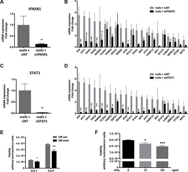 Luciferase assay was performed in 96-well plate using the Dual-Luciferase Reporter Assay System (Promega) following the manufacturer’s instructions. In brief, adherent HEK293 cells were transiently transfected (lipofectamine, Invivogen) with the ISRE (interferon sensitive responder element) luciferase responder plasmid [66] and the Renilla plasmid used for normalization. For experiments involving STAT1 silencing, siSTAT1 or siNT were transiently transfected using interferin reagent (Polyplus) 24 h before reporter plasmid transfection. Twenty four hours later, cells were stimulated for 24 h with CMveh or CMmafo, containing or not AG490 (50 μM) or DMSO (vehicle). The luminescence activity in cell lysates was measured using a Mithras LB940 (Berthold) and data were analyzed using the MicroWin2000 software.