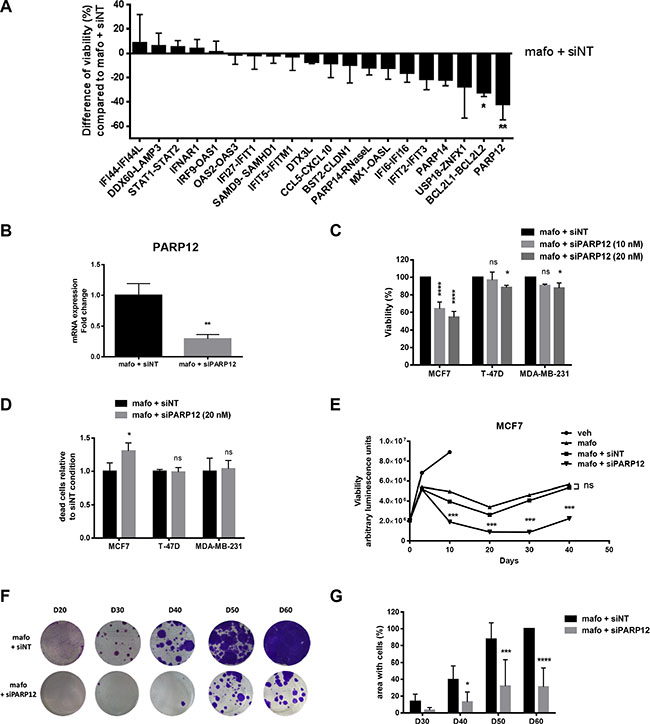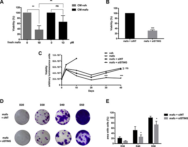 Cells were treated 24 h post-seeding or later (as indicated) with 10 μM mafosfamide or vehicle (water). Using interferin reagent (Polyplus transfection), cells were transfected with the following siRNA (GE Dharmacon): siNonTargeted (ON-TARGETplus SMARTpool D-001810-10-05), siSTING (ON-TARGETplus SMARTpool L-024333-02-0005), siIFNAR1 (ON-TARGETplus SMARTpool L-020209-00-0005), siSTAT1 (ON-TARGETplus SMARTpool L-003543-00-0005). Using cherry-pick RNAi libraries of Dharmacon, we screened 35 siRNAs (sequences available upon request) in combination with mafosfamide. In brief, cells were seeded in 96-well-plates and treated with 10 μM mafosfamide 24 h later. Three days after treatment, siRNAs were added, then fresh medium was added to the cell three days after siRNAs addition and the plate were analyzed 10 days after mafosfamide treatment using cell viability test (see below).