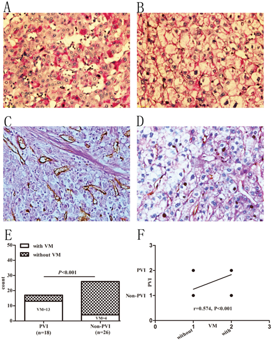 Because of the marked vascularity inside HCC, regional portal vein and its branches turn into the main countercurrent vessel for tumor mass [22]. Tumor related angiogenesis thus potentially contributes to PVI. A study has demonstrated that microvascular density and VEGF have close association with PVI [23]. However, the relationship between VM and PVI is still unclear. We speculated that VM may contribute to the incidence of PVI. The present study was conducted to investigate the relationship between VM and PVI in patients with HCC.