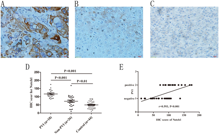 Figure 2: Immunohistochemical staining of Notch1 in HCC specimens and its association with PVI. A. Notch1 staining in HCC specimens with PVI, B. Notch1 staining in HCC specimens without PVI, C. Notch1 staining in adjacent non-tumor specimens. Original magnification: 400×. D. Different staining density and proportion of Notch1 in specimens of PVI, non-PVI and control (non-tumor) specimens. E. Spearman correlation analysis indicated a positive correlation between Notch1 expression and PVI.