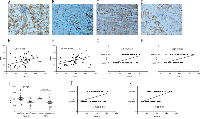 Figure 4: Increased expressions of MMPs associated with VM and higher incidence of PVI. A and B. MMP-9 immunohistochemical staining in HCC with and without PVI, original magnification: 400×. C and D. MMP-2 immunohistochemical staining in HCC with and without PVI, original magnification: 400×. E and F. MMP-2, MMP-9 IHC score were correlated with Notch1. G and H. MMP-2 and MMP-9 expression positively correlated with VM. I: MMP-2 and MMP-9 significantly increased in PVI group compared with non-PVI group. J and K: MMP-2, MMP-9 IHC score were positively correlated with PVI.