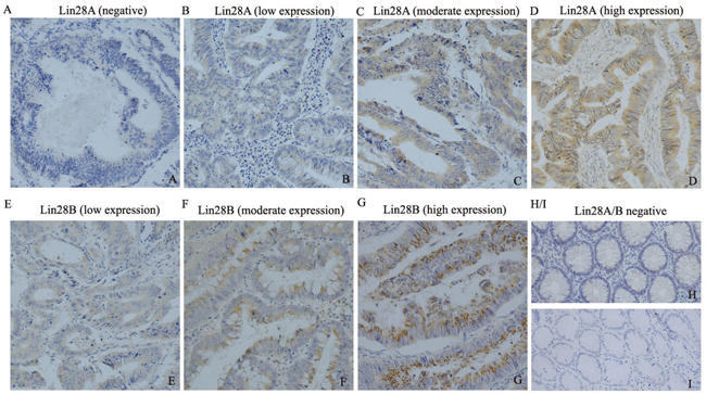 Figure 1: The expression pattern of Lin28A and Lin28B in colon cancer tissues detected by immunohistochemistry (200×). A-D. illustrates the expression of Lin28A in colon cancer tissues variated from negative to high expression; whereas E-G. illustrates the expression of Lin28B in colon cancer tissues variated from low to high expression (n=65). H and I. illustrate the negative expression of Lin28A and Lin28B in normal colon tissues (n=10) respectively.