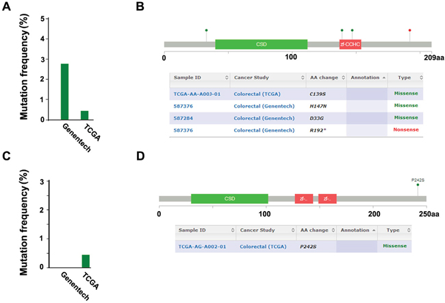 Figure 3: Detection of the mutation of Lin28A and Lin28B in colon cancer samples based on the cBioPortal cancer genomic data. A. The mutation frequency of Lin28A (n=703, 631 from TCGA and 72 from Genentech). B. The mutation types and sites of Lin28A protein. C. The mutation frequency of Lin28B (n=703, 631 from TCGA and 72 from Genentech). D. The mutation types and sites of Lin28B protein.