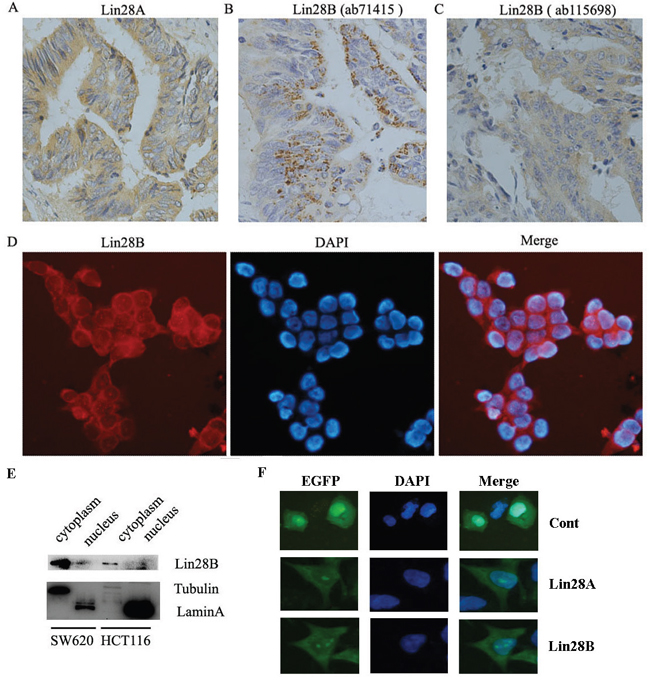 Figure 4: Lin28A and Lin28B are predominantly distributed in the cytoplasm of colon cancer cells. A. Lin28A was distributed in the cytoplasm of colon cancer cells (×400). B and C. The cytoplasm distribution of Lin28B in colon cancer tissues illustrated by immunohistochemistry with different antibody against-Lin28B (×400). D. The cytoplasm distribution of Lin28B in SW620 cells illustrated by immunofluorescence (×400). E. The cytoplasm distribution of Lin28B in SW620 and HCT116 cells illustrated by subcellular proteins immunoblot. F. The cytoplasm distribution of Lin28A-EGFP and Lin28B-EGFP in HCT116 cells detected by fluorescent microscope (×400).