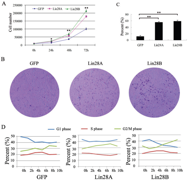 Figure 7: Both Lin28A and Lin28B promote the proliferation of HCT116 cells. A. Both of Lin28A and Lin28B promote the proliferation of HCT116 cells detected by cell growth curve assay (*: P<0.05; **: P<0.01). B and C. Both of Lin28A and Lin28B promotes the proliferation of HCT116 cells detected by clone formation assay (**: P<0.01). D. The cell cycle assay demonstrated that Lin28A promotes the transition of cell cycle from S phase to G2/M phase, whereas Lin28B facilitates the transition of cell cycle from both G1 phase to S phase and S phase to G2/M phase.