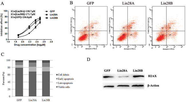 Figure 8: Both Lin28A and Lin28B enhance the apoptosis of HCT116 cells induced by 5-Fu. A. Both Lin28A and Lin28B promote the chemosensitivity of HCT116 cells to 5-Fu. B and C. Both of Lin28A and Lin28B enhance the apoptosis of HCT116 cells induced by 5-Fu. D. Lin28A instead of Lin28B suppresses the expression of H2AX.