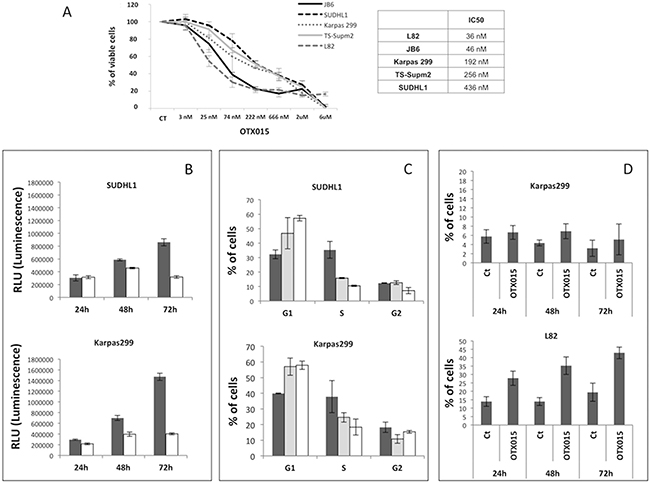 Figure 1: OTX015 displays antiproliferative activity in ALK-positive ALCL in vitro models. A. The antiproliferative activity of OTX015 was determined with the MTT assay in a panel of ALK+ ALCL cell lines treated for 72 h with a range of OTX015 doses (3 nM to 6 μM) according to IC50 values. CT, DMSO-treated controls. B. Antiproliferative activity was evaluated using the ATPlite assay after 24, 48 and 72 h exposure to 500 nM OTX015 (solid color bar corresponds to vehicle [DMSO], open bar to OTX015). C. FACScan flow cytometry showed that 24 h OTX015 exposure (250 and 500 nM) led to G1 cell cycle arrest in all cell lines with the exception of L82 (solid color bar corresponds to vehicle [DMSO], dotted bar to 250 nM and open bar to 500 nM). D. Percent apoptosis after 24, 48 and 72-h exposure to 500 nM OTX015. Long exposure (72 h) was associated with an increased rate of apoptosis. Ct, DMSO-treated control.