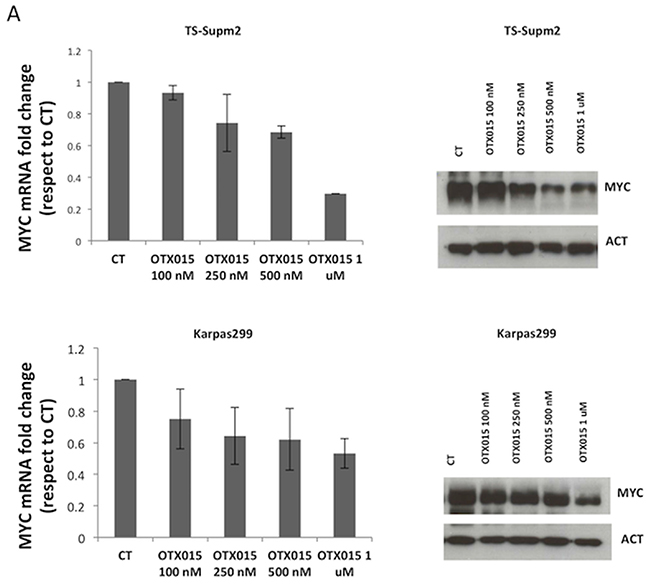 Comparison of OTX015 and JQ1, an analog of OTX015 and a bona fide BRD inhibitor, whose mechanism of action and efficacy have been extensively validated in vitro [16, 18], demonstrated comparable MYC mRNA and protein down-regulation (Supplementary Figure S3A and S3B).