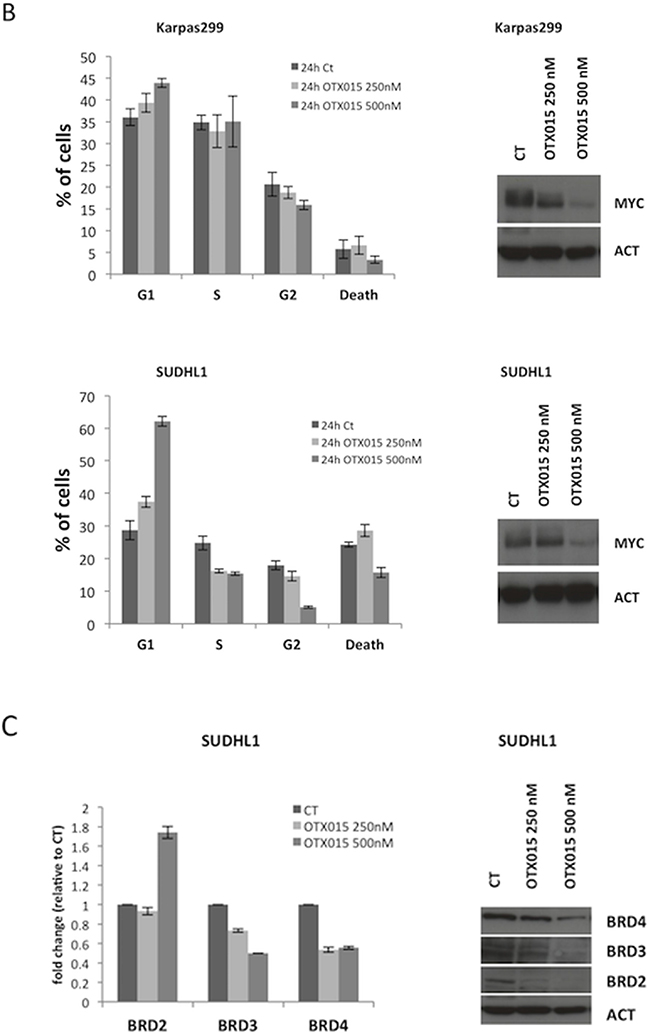 Figure 2: OTX015 modulates MYC and BRD expression. A. MYC mRNA and protein levels were reproducibly down-regulated after 72-h OTX015 exposure (100 - 1000 nM) in ALK+ cell lines by qRT-PCR and Western blot respectively. CT, DMSO-treated controls. B. 24 h exposure to OTX015 (250, 500 nM) led to dose-dependent down-regulation of MYC protein levels and G1 cell cycle arrest. β-actin was used as a protein loading control. C. 24 h exposure to OTX015 resulted in down-regulation of BRD2, BRD3 and BRD4 RNA and protein levels by qRT-PCR and Western blot. β-actin was used as a protein loading control.