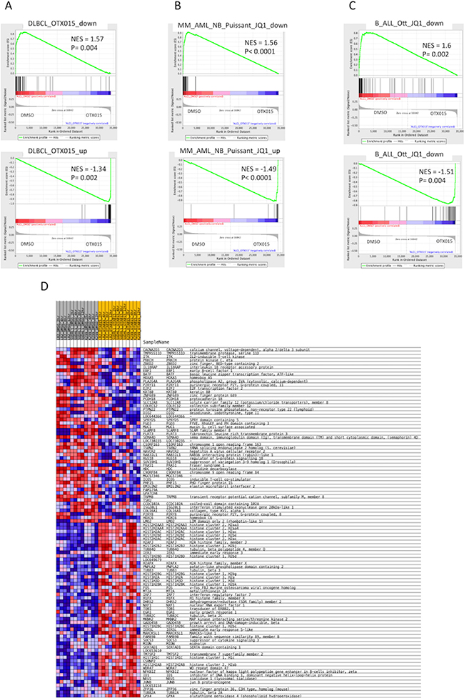 Figure 4: OTX015 affects the transcriptome of ALK+ ALCL cells, partially recapitulating gene expression changes observed in other preclinical cancer models exposed to OTX015 or JQ1. Gene expression profiling followed by gene set enrichment analysis was performed in three ALK+ ALCL cell lines (SUDHL1, Karpas299, L82) after exposure to DMSO or OTX015 (500 nM) for 2, 4, 8 or 12 h. Enrichment plots for gene sets obtained in A. DLBCL cells exposed to OTX015 [22], B. multiple myeloma, acute myeloid leukemias, neuroblastoma [20] treated with JQ1 and C. in B-cell acute lymphoblastic leukemia cells exposed to JQ1 [36]. NES = normalized enrichment score. D. The heatmap shows the top 50 up-regulated (upper part) and top 50 down-regulated (lower part) following treatment with OTX015. Samples labeled in grey are DMSO-treated control cells and samples labelled in yellow are OTX015-treated cells, for all three cell lines and at each time point. Red denotes high expression, blue denotes low expression.