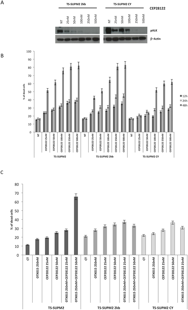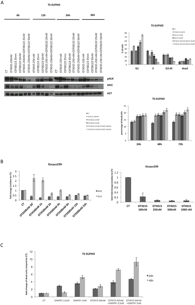 HEK 293T packaging cells were transfected with NPM-ALK C1156Y (mutated) or NPM-ALK control (wildtype) lentiviral vector in combination with third-generation helper plasmids. The viral supernatant was collected after 48 h, filtered, and TS-Supm2 ALCL cells were infected. After three cycle of infection, infected cells were selected with puromycin (1 μg/ml). Selected cells were treated with CEP28122, OTX015 or GANT61 (single agent or in combination) or with an equivalent concentration of vehicle and harvested at different time points (12 to 72 h) after drug exposure. Protein was extracted for Western blotting or cells were harvested for cell cycle analysis.