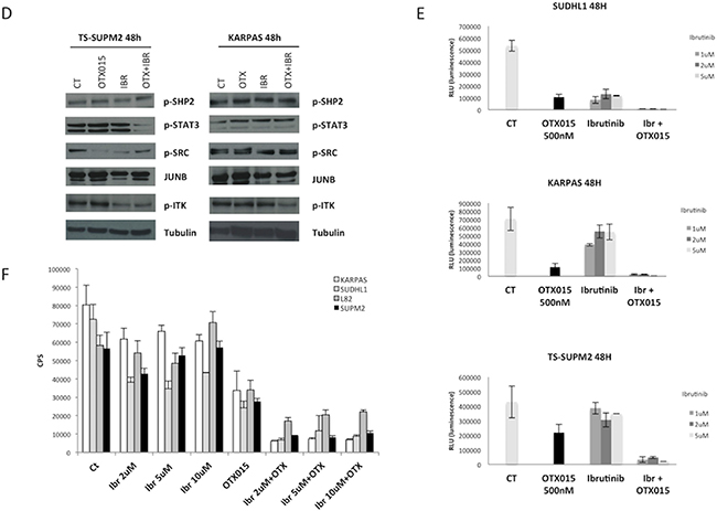 Having demonstrated that OTX015 led to interleukin-2-inducible kinase (ITK) down-regulation and given that deregulated ITK signaling is pathogenetic in some T-cell lymphomas [31, 32], we tested the therapeutic efficacy of ibrutinib, a selective inhibitor of Bruton’s tyrosine kinase/ITK as a single agent or in combination with OTX015. Further support for this combination comes from preclinical studies showing strong synergy between BET inhibitors and ibrutinib in B-cell lymphoma [33]. As shown in Figure 5D, the dual drug combination led to substantial downregulation of pITK, and ibrutinib/OTX015-treated cells underwent growth inhibition followed by cell death (Figures 5D, 5E) [22, 34].