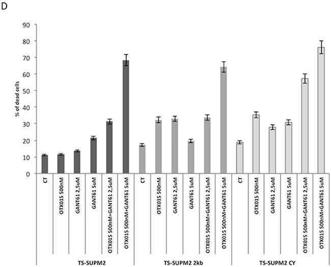 We then evaluated the effect of selective inhibition of the SHH/GLI1 pathway, known to control cell growth in ALCL cells [7]. Exposure to OTX015 led to dose-dependent robust down-regulation of GLI1 following an initial spike in expression (Figure 5B). ALCL cells treated with combined OTX015 (500 nM) and GANT61 (5 μM), a selective GLI1/2 inhibitor [30], had higher rates of apoptosis compared to cells treated with either single agent drug (Figure 5C).
