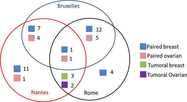 Figure 1: Scheme of the multicenter BRCA FFT study. Each colored square represents a type of sample where blue= paired tumor and normal breast sample, red=paired tumor and normal ovarian sample, green= tumor breast sample and purple= tumor ovarian sample. The number next to each colored square represents the number of samples tested by each center (Brussels, Nantes and Rome).
