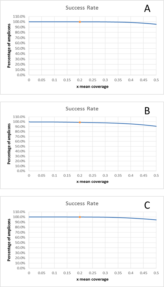 Figure 2: Coverage uniformity plots for the 3 centers. A.100.0% > 0.2x mean (Nantes), B: 98.7% > 0.2x mean (Rome), C: 99.96% > 0.2x mean (Brussels).