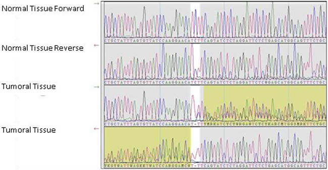 Figure 3: Sanger sequencing confirmatory run. Electropherograms showing the hg19 chr17:g.41246443 position in the normal tissue and ovarian tumor tissue of a sample exhibiting a somatic frameshift mutation